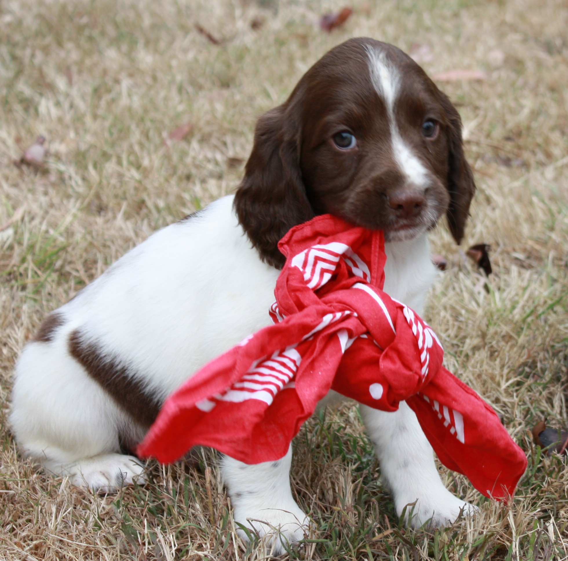 You will see in many photo’s puppies carrying a red polka dot handkerchief. I roll them up and use them to see if the pup will retrieve naturally.